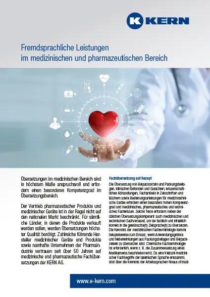 KERN bietet fachkundige Übersetzungen und Lokalisierungen für den medizinischen und pharmazeutischen Bereich – z. B. für Bedienungsanleitungen medizinischer Geräte, Packungsbeilagen, Zulassungsdokumente, Studien, medizinische Gutachten und regulatorische Texte.