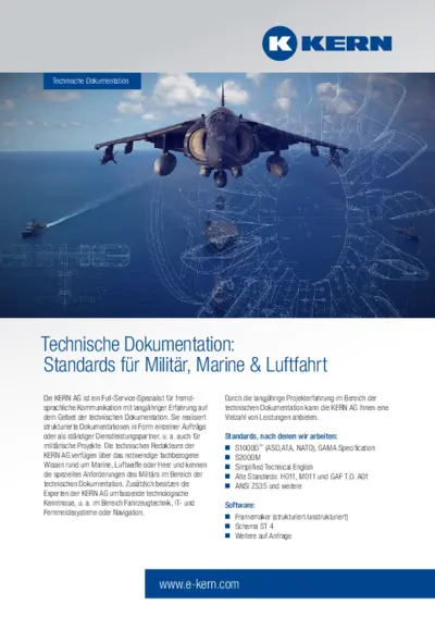 Verteidigung und Sicherheit erfordern nicht nur sprachliche Präzision, sondern absolute Vertraulichkeit und die Einhaltung internationaler Standards. Die KERN AG arbeitet nach etablierten Normen wie S1000D™, S2000M, Simplified Technical English sowie weiteren branchenspezifischen Standards.